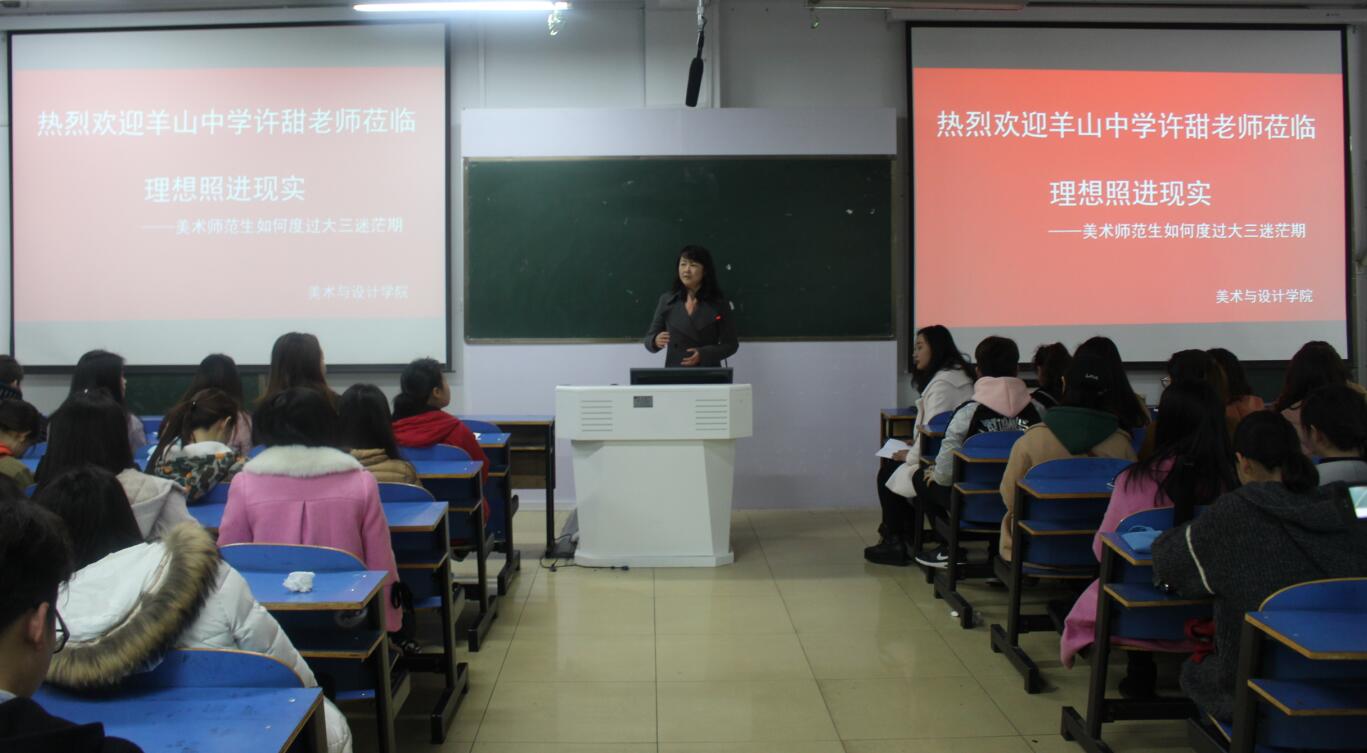 3月22日,应完美体育平台官网邀请,信阳市羊山中学美术教师许甜在艺术楼307室作题为“理想照进现实——美术师范生如何度过三大迷茫期”的专题讲座,完美体育官网副院长涂湘东与近百名学子共同聆听了讲座,讲座由涂湘东主持。